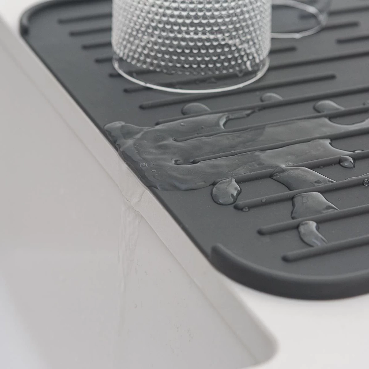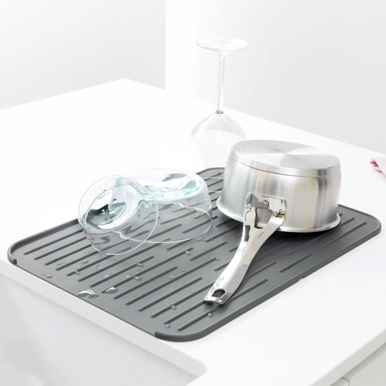 For quick in-between dishwashing jobs, this silicone dish drying mat by Brabantia provides effortless drying space without your worktop getting wet. Dishwasher safe, the drying mat is made of durable non-skid silicone- suitable for dishes, mugs and even fragile glassware. The pouring lip allows water from the dripping dishes etc to run directly into the sink leaving your worktop dry.
