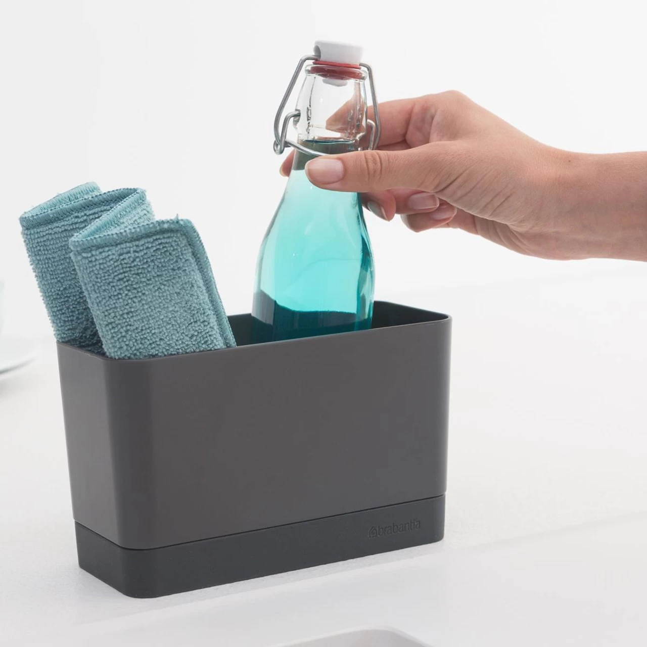 Keep your sink space nice and tidy with this sleek sink organiser by Brabantia. The compact design boasts ample room to hold your washing up essentials and features a seperate non-skid drip tray to dispose of any excess liquid.