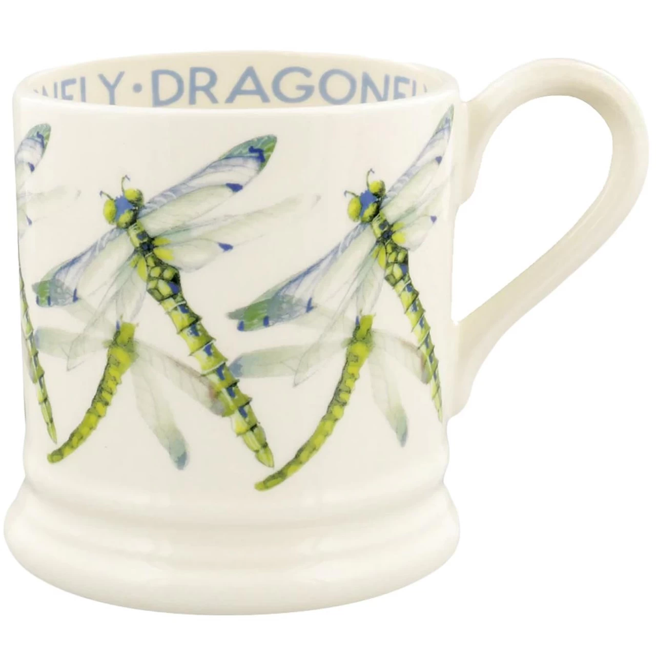 The Emma Bridgewater Dragonfly Half Pint Mug is made from English Earthenware which has been crafted in the United Kingdom at the Emma Bridgewater factory. The first pottery is dishwasher safe and features a detailed repetitive design of dragonflies with bold lettering surrounding the inner walls of the mug.