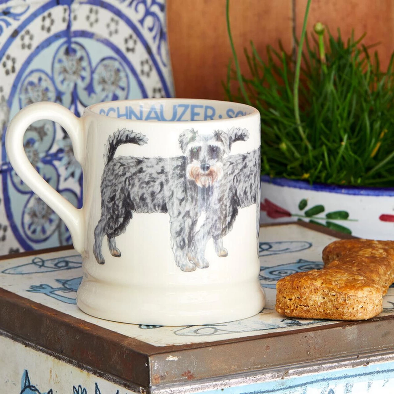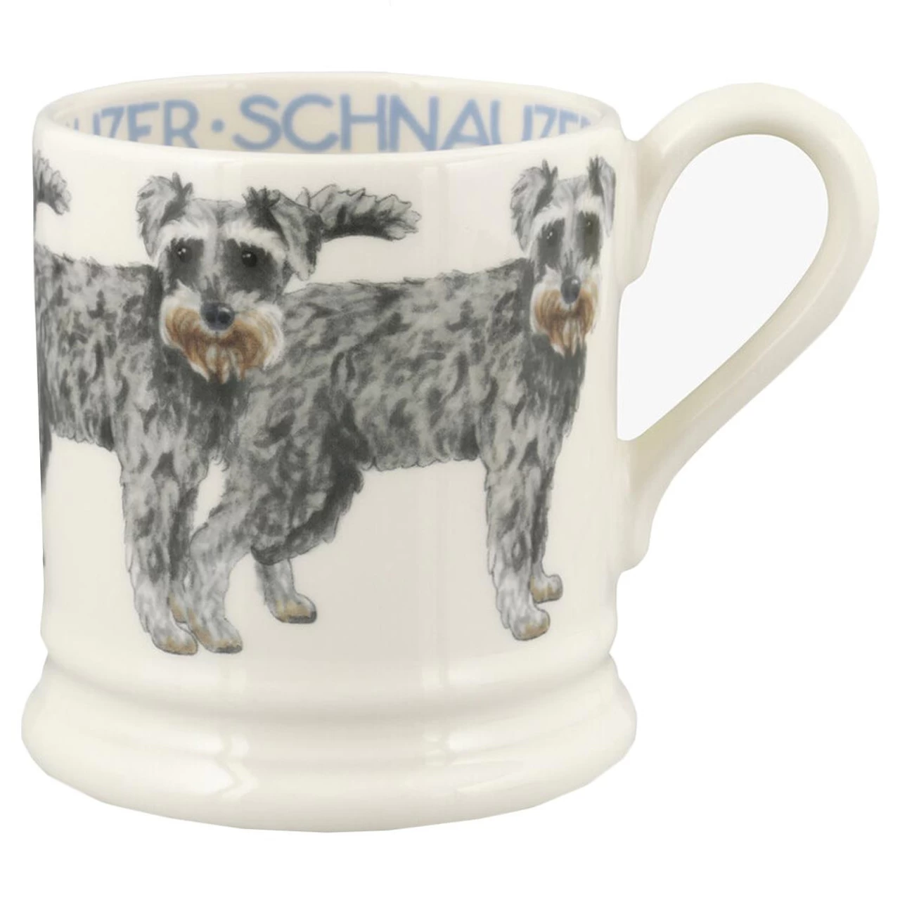 The Emma Bridgewater half pint Schnauzer mug is perfect for any Schnauzer dog lover! The mug is made in Stoke-on-Trent and is dishwasher safe so you can clean it with ease! The mug has the classic Emma Bridgewater shape and design so it will fit in with your collection! The mug has Schnauzers on the outside and script detailing on the inner. It would make a great present for a dog lover!