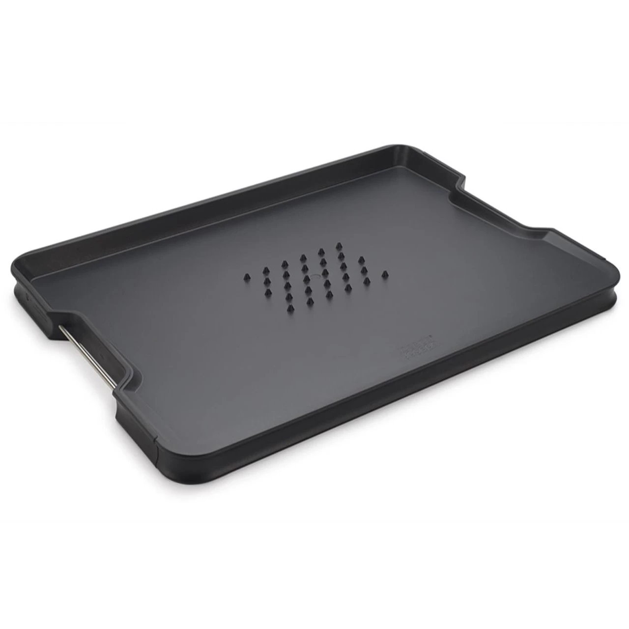 The Cut & Carve Chopping Board from Joseph Joseph is a double-sided, multi-function chopping board, packed with innovative features. The chopping board has a unique angled base, raised edges and easy-pour corners, which all help in the collection and disposal of crumbs or liquids when cutting or carving. On one side of the board, there’s an integrated meat grip for extra help when carving, whilst the other side provides a smooth cutting surface for general food preparation. Non-slip edges make sure the board stays firmly in place during use and features stainless-steel handles on the sides for easier lifting and carrying.