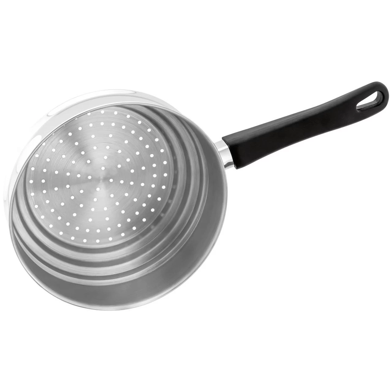 - Space saving design conviniently stacks into existing saucepan range