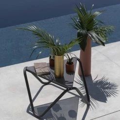 Place your drink upon the Lafuma Vogue Side Table, perfect for pool side refreshments. This triangle shaped table features a 22mm aluminium tubing and a perforated lacquered steel table top that is also UV resistant. When not in use, it can be stacked up with other tables to help with storage.