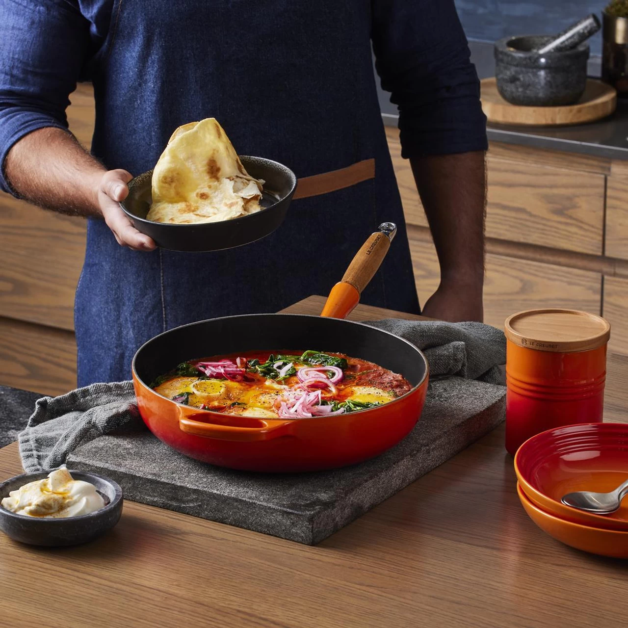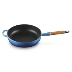 The Le Creuset 28cm Cast Iron Saute Pan With Wooden Handle. Crafted from cast iron, the saute pan has higher sidewalls for cooking down liquids and heat is distributed evenly to make frying or sauteing your food a pleasure. The ergonomic helper handle allows for better grip while the stay-cool wooden handle offers exceptional comfort when handling. Handwash only, this saute pan is suitable on all hob types, including induction.