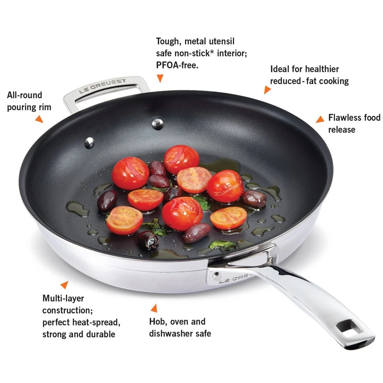 The Le Creuset 28cm 3 Ply Stainless Steel Non-stick Frying Pan will evenly heat up your food from base to rim and its technologically advanced non-stick coating will release food so easily that little fat is required. Suitable for all heat sources, including induction.