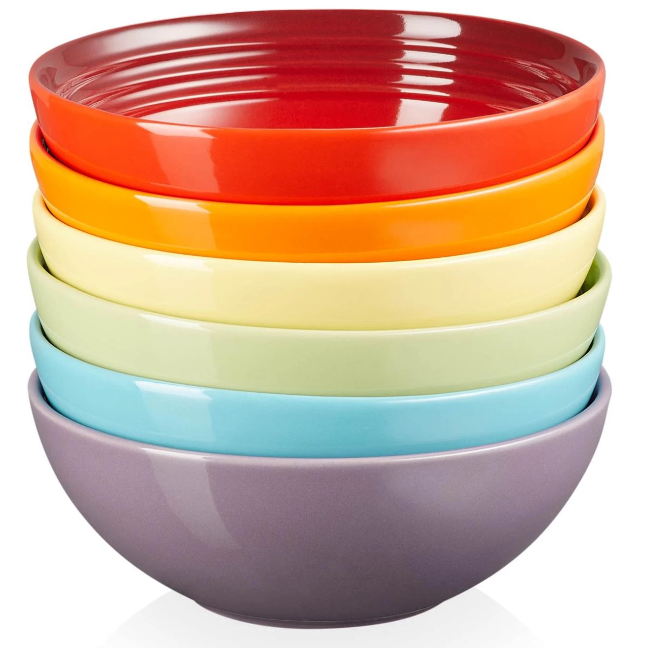 The Le Creuset Stoneware Rainbow Set Of 6 Cereal Bowls make a great gift option and come complete in a boxed. The 16cm cereal bowls are made from high quality stoneware which is dishwasher safe for easy cleaning. Furthermore the bowls have a three-ring design that will co-ordinate with the rest of your Le Creuset dinnerware.