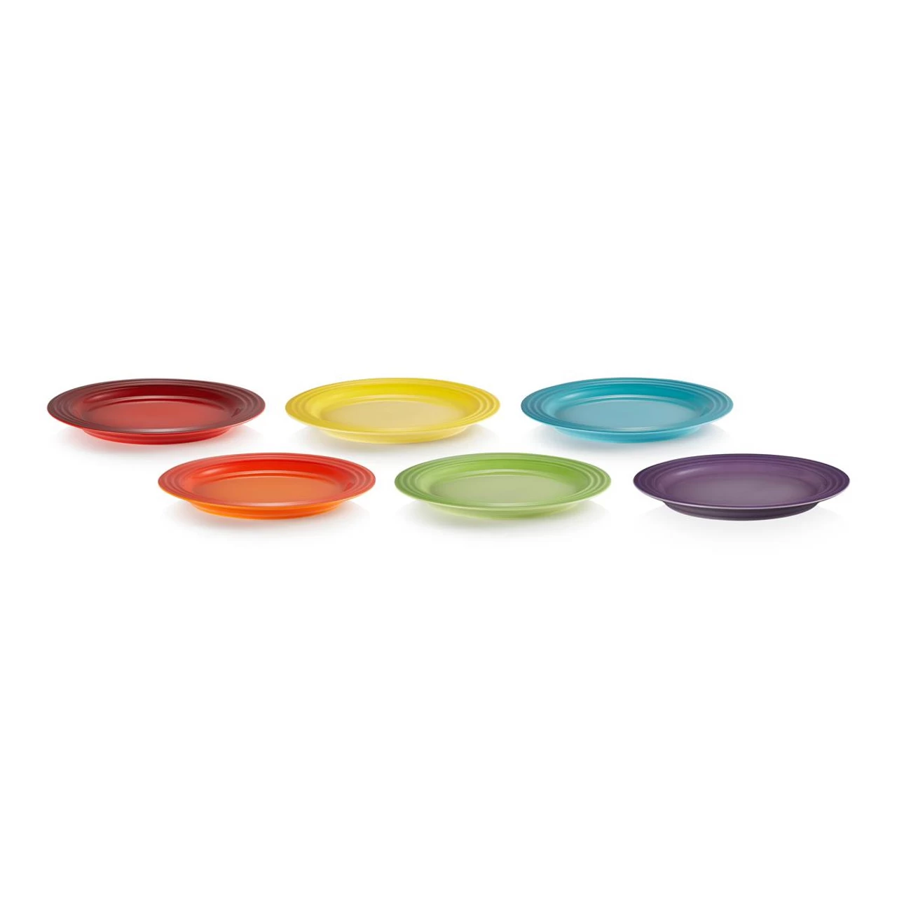 This colourful collection of Le Creuset Rainbow Side Plates makes a joyous gift for loved ones and friends alike. The Le Creuset Rainbow Dinner Set of 6 contains six 22cm Le Creuset Rainbow Side Plates in Cerise, Volcanic, Palm Green, Soleil Yellow, Teal and Ultra Violet. Each Le Creuset Rainbow Side Plate has a diameter of 22cm, ideal for serving up an array of small dishes or tapas with friends and family. Le Creuset Stoneware is crafted by artisans using specialist clays and bright, beautiful, glazes. These vivid and vibrant plates are strong, scratch-resistant and simple to clean. The Le Creuset Rainbow Dinner Set features the iconic Le Creuset three-ring design which will fit perfectly into your existing Le Creuset collection of stoneware and cast iron.