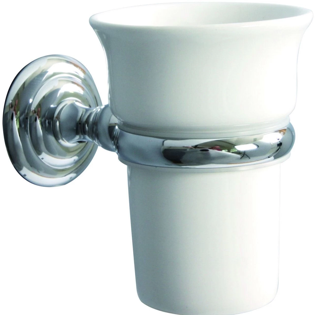 The Richmond tumbler holder features an elegant white ceramic tumbler that sits into a chrome finished solid brass holder which has concealed fixings for a stylish look. Hold toothbrushes, lotions, and potions or shavers in this holder that is kept out-of-the-way due to its wall-mounted fixings.