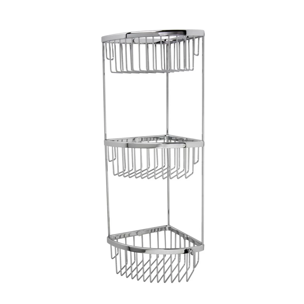A bathroom accessory to fit within any bathroom interior due to the simple design. A super practical caddy basket selection that has included, concealed fixings. Made from brass and finished in classic chrome with plenty of basket space for shampoo and soap. With practical hook to hang a shower hair comb or soap on a string. Available in two different sizes; a choice of a duo of joined baskets or three tiers.