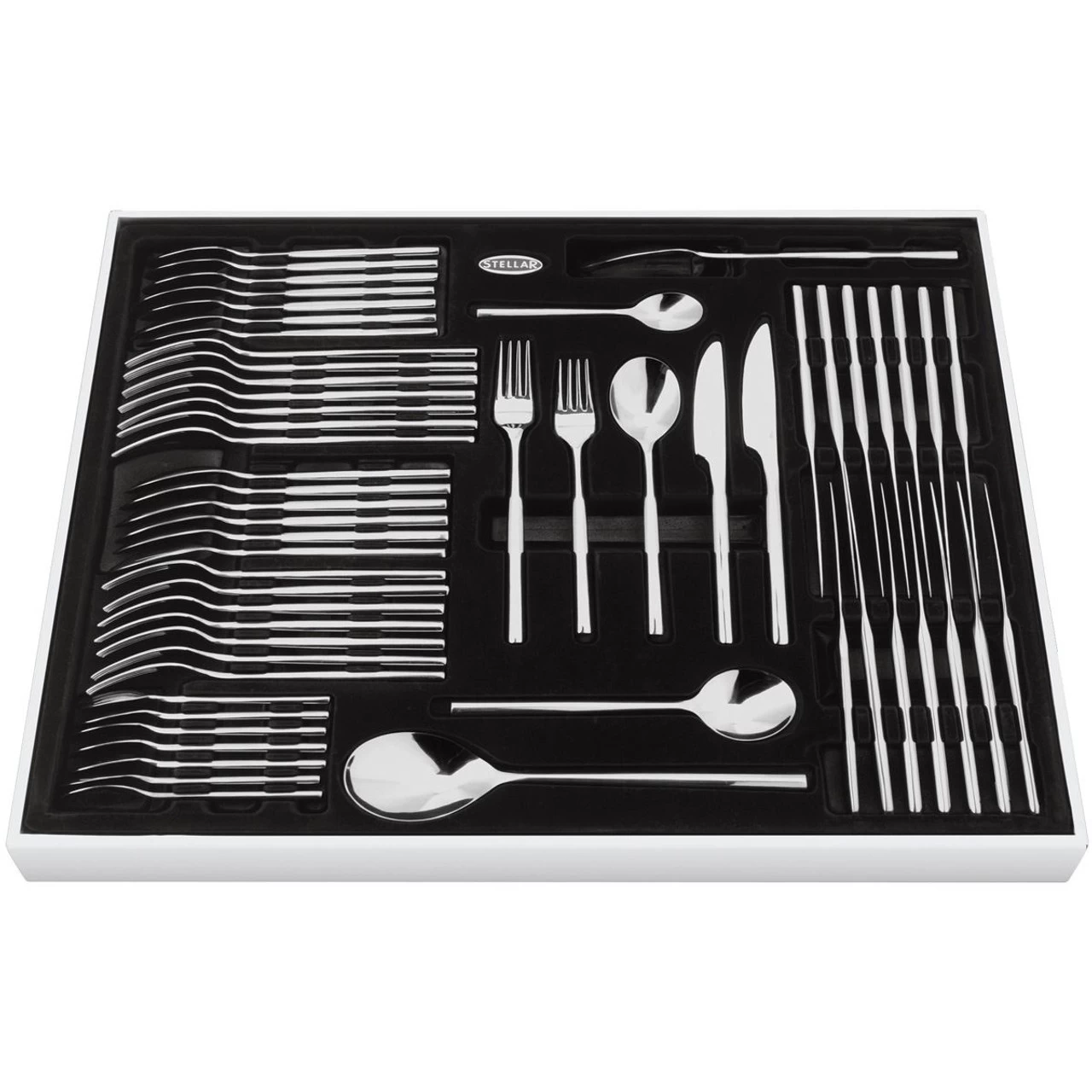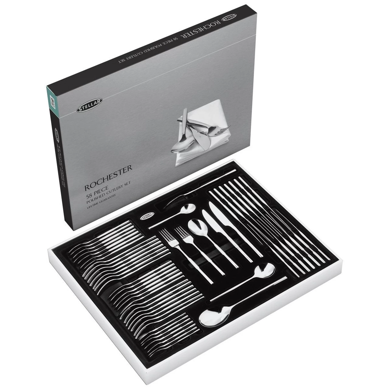 58 piece stainless steel Stellar Rochester cutlery set, complete with presentation box. Made from supreme quality polished 18/10 stainless steel. All Stellar Rochester cutlery is dishwasher safe and comes with a lifetime guarantee.