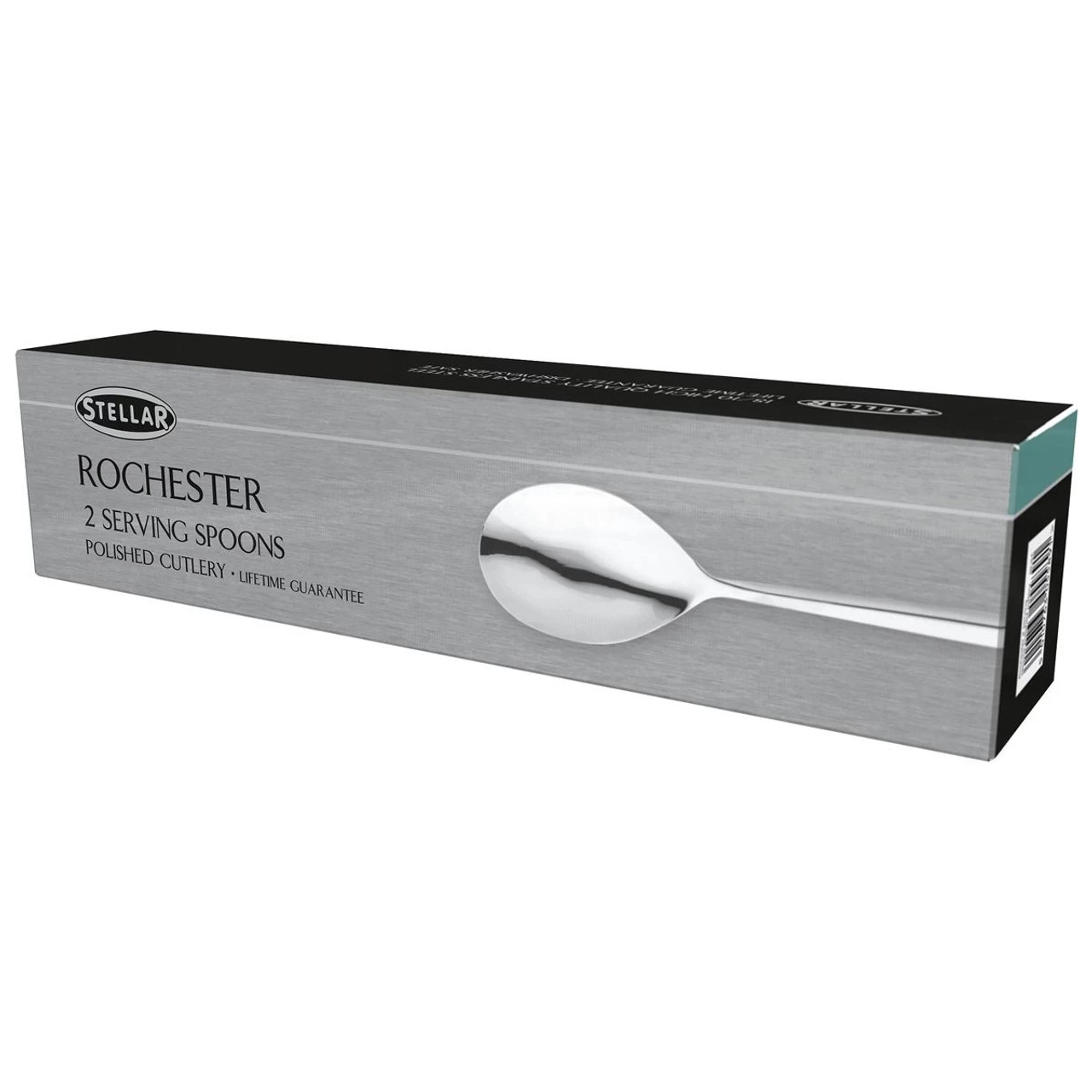 Set of 2 classic design serving spoons from the Stellar Rochester range. Made from superb quality 18/10 stainless steel that will last a lifetime if cared for correctly. Stellar cutlery is dishwasher safe and comes with a lifetime guarantee.