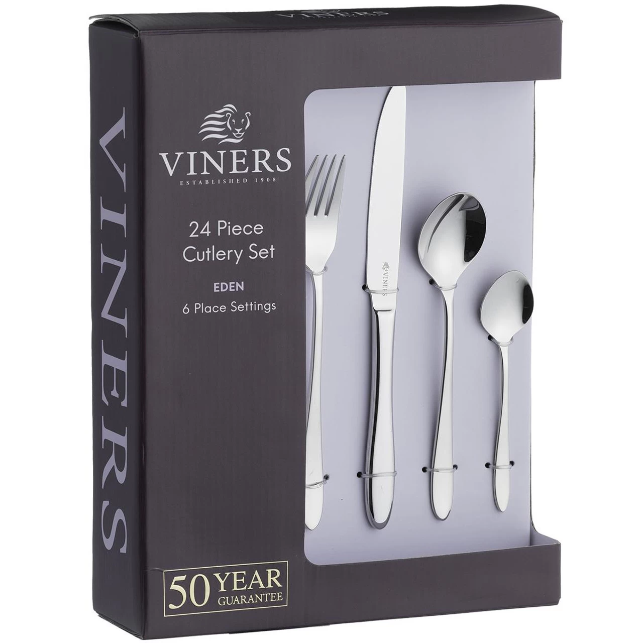 The Viners Eden 24 Piece Cutlery Set contains 6 place setting of high-quality cutlery for you to set the table with. The set includes 6 of each of the following: table knives, table forks, teaspoons and dessert spoons all neatly presented in a gift box. The cutlery is crafted from fine quality 18/10 stainless steel and then given a polished mirror finish.